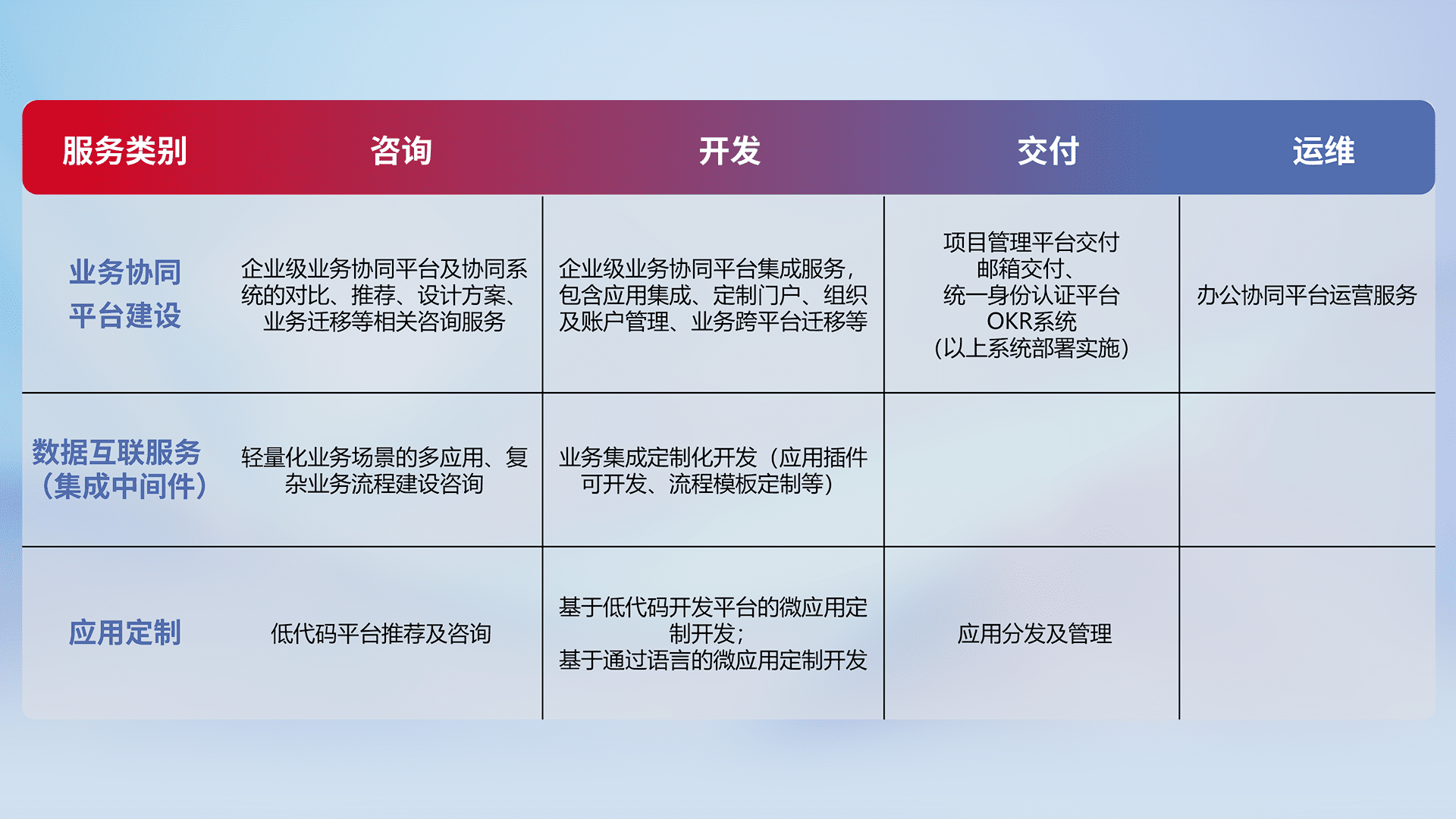 针对钉钉、、、、企微、、、IDaas等平台级产品提供产品的规划、、、方案、、、、交付、、、、定制化开发等服务,,,实现如统一协同办公、、、智能客户服务、、、混合会议管理、、智能数据查询、、、等业务场景,,,,实现数字化转型。。