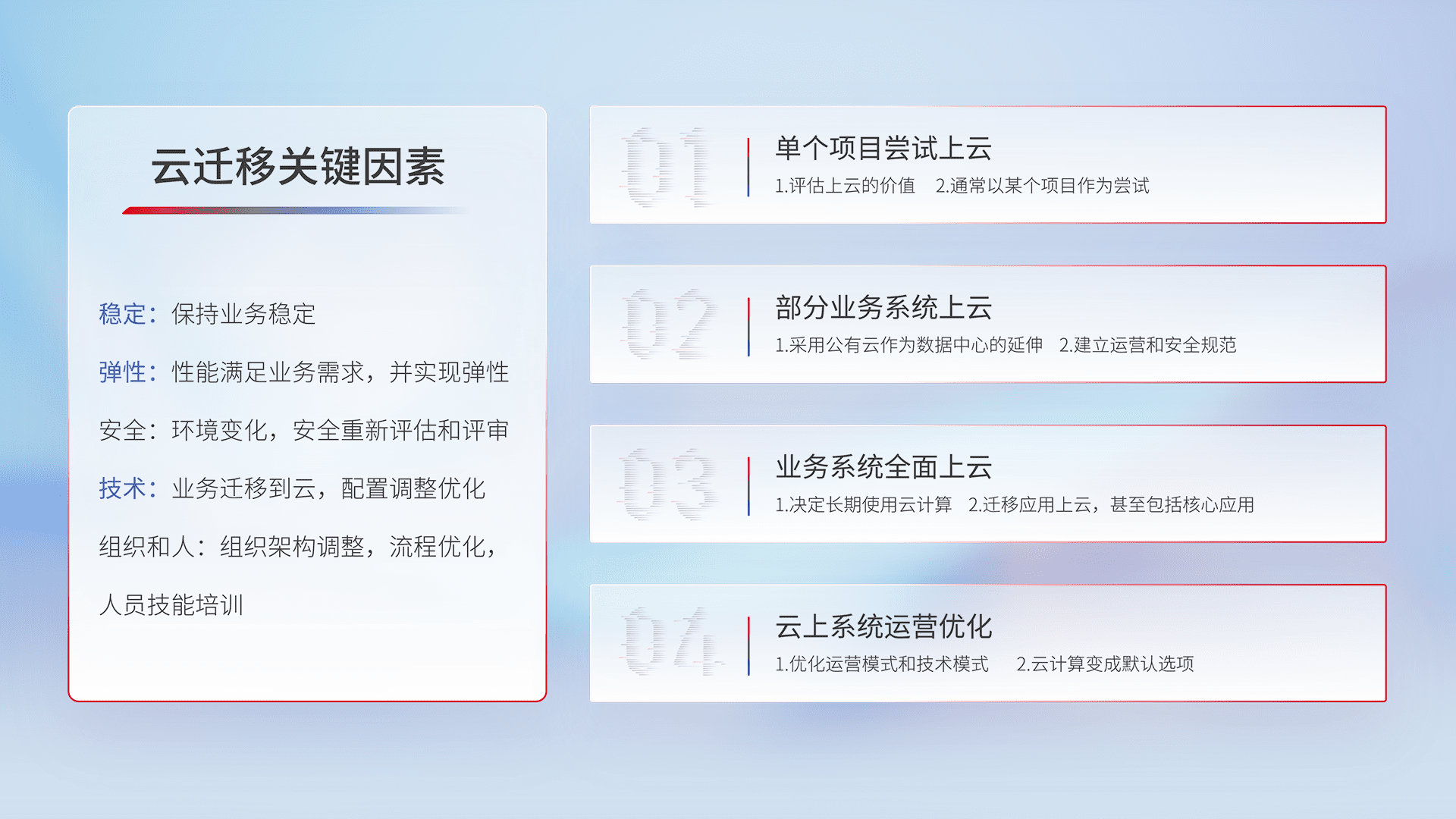 结合实际业务,,,从规划设计、、云平台选型、、、、云原生改造、、、、数据迁移、、、、集成交付,,迁移全过程为客户识别最佳上云路径,,做好风险识别管理,,,,设计网络架构、、、身份权限、、安全审计合规、、、、操作审计、、、日志审计、、、监控告警策略、、、、多站点容灾设计等,,,对云上基础设施进行整体规划,,提升IT治理水平,,以满足弹性、、高可用、、、、高性能的需求。。。。