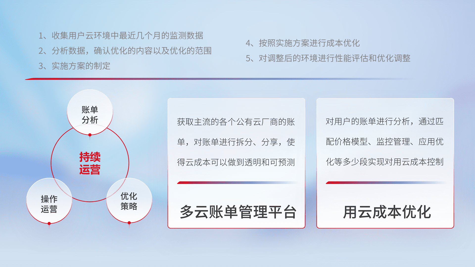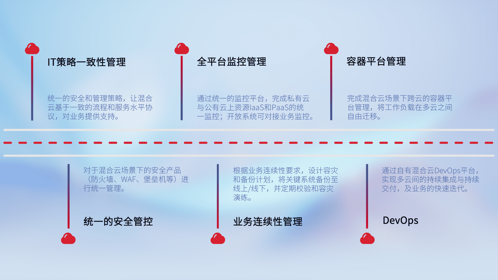 通过多云纳管,,以统一的资源数据模型把客户的云资源进行抽象和封装,,,,进而实现对多云资源的统一操作,,保障云资源管理的可靠性、、稳定性与可用性。。量身定制化运维内容,,,配置、、、、开发运维、、补丁管理、、、、备份、、、、监控、、、认证和访问管理、、、、审计和日常巡检等,,,,保障在用云过程中的可靠度,,稳定度以及高可用率。。