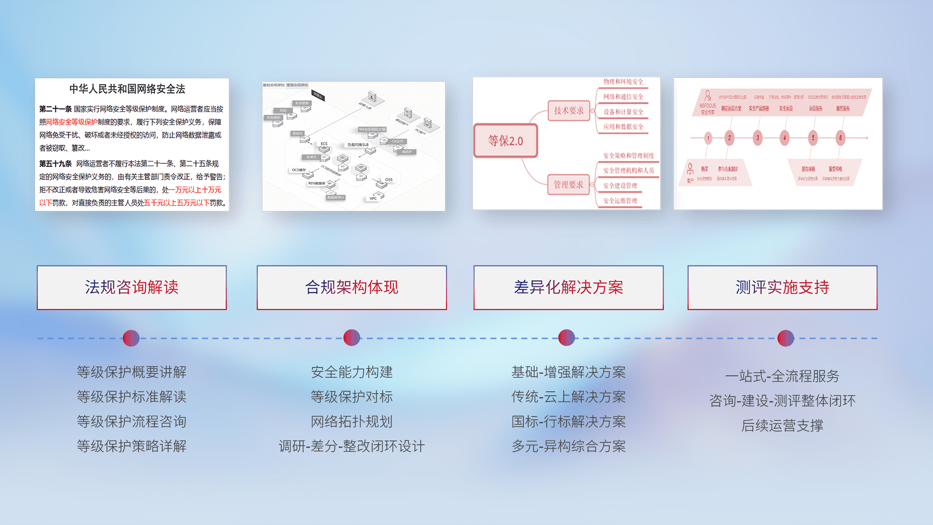通过专业的法律咨询解读、、合规架构体现、、、差异化解决方案、、、、测试实施支持等服务,,为客户量身打造等保合规体系。。。